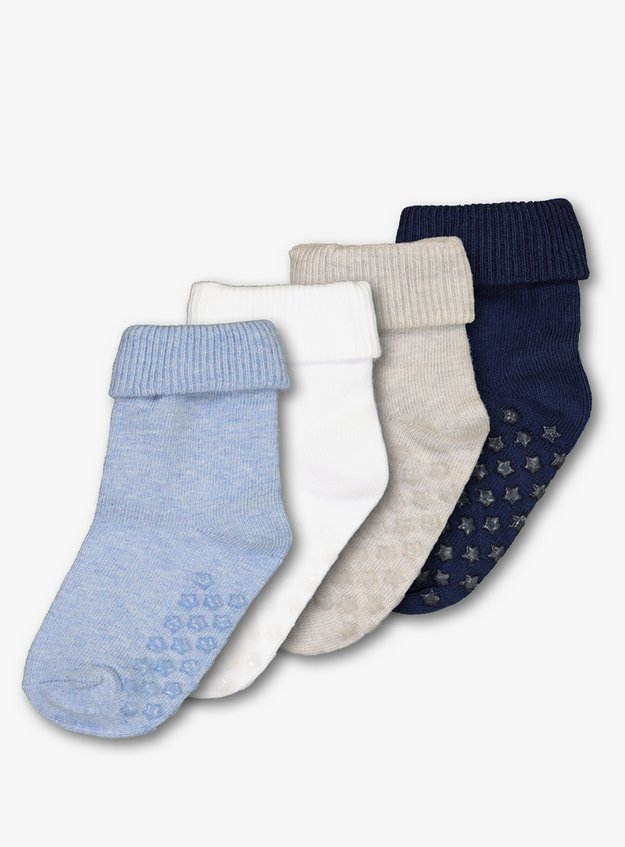 Blue Roll Top Socks 4 Pack 0-24 months. Boys Blue Grey Print Trainer Socks Newborn-12mths 300. Sock Ons 2-Pack 800.